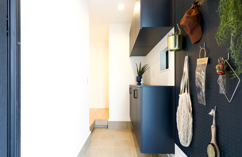 小窓を配置し外の光や風を取り込む明るい玄関には、便利に使える有孔ボードを設けました。お出かけ時に使う帽子をかけたり、物やアート・グリーンを飾って、ディスプレイコーナーとしても楽しめます。また、壁面には電源コンセントを配置しているので、電動自転車の充電にも便利。通常より奥行のある玄関は圧迫感がなく開放的な雰囲気。帰宅時に、ベビーカーをたたまずに置くスペースがあるのもうれしいですね。
