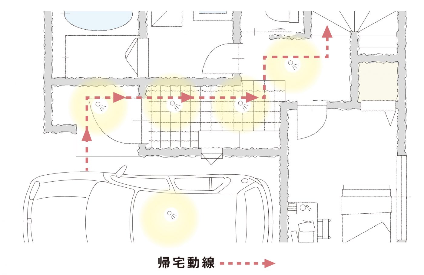 夜に帰ってきた時は、ポーチから玄関ホールまで、自動点灯で明るい光が出迎えてくれます。たくさんの買い物袋やベビーカーなどで、両手がふさがっていても、スイッチを押さずにスムーズに移動。『うっかり消し忘れ』や、小さなお子さまの『スイッチまで手が届かない』という問題もこれで解決!防犯対策にも◎