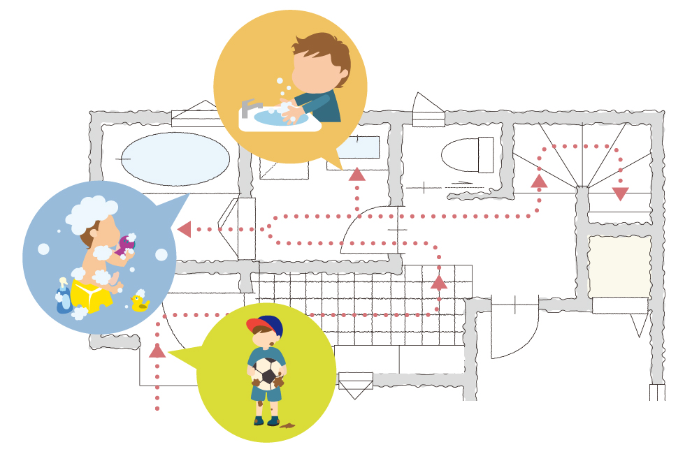 外遊びやスポーツで汚れて帰ってきても、1階に洗面・浴室・洗濯機が揃っているので、いつでもすぐに清潔に。①洗面:手洗い・うがい→②浴室:お風呂やシャワー、着替えを済ませサッパリ→③2階のリビングへ♪花粉の季節もお部屋に花粉を持ち込みません。