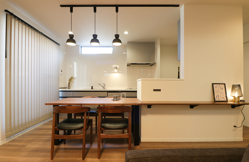 カップボードの横並びに、キッチンとリビングをゆるりと区切る、ダイニングスペースを設けました。キッチンで料理をしたり、リビングでくつろいでいても、近すぎず、遠すぎない、程よい距離感で過ごせます。カップボード前にはダイニングテーブルの延長として使える、備え付けのカウンターを設けました。食事だけでなく、パソコンスペースや子供のスタディーコーナーなど、家族の共有スペースとしても使えるので、リビングにいる時間が自然と増えそうです。