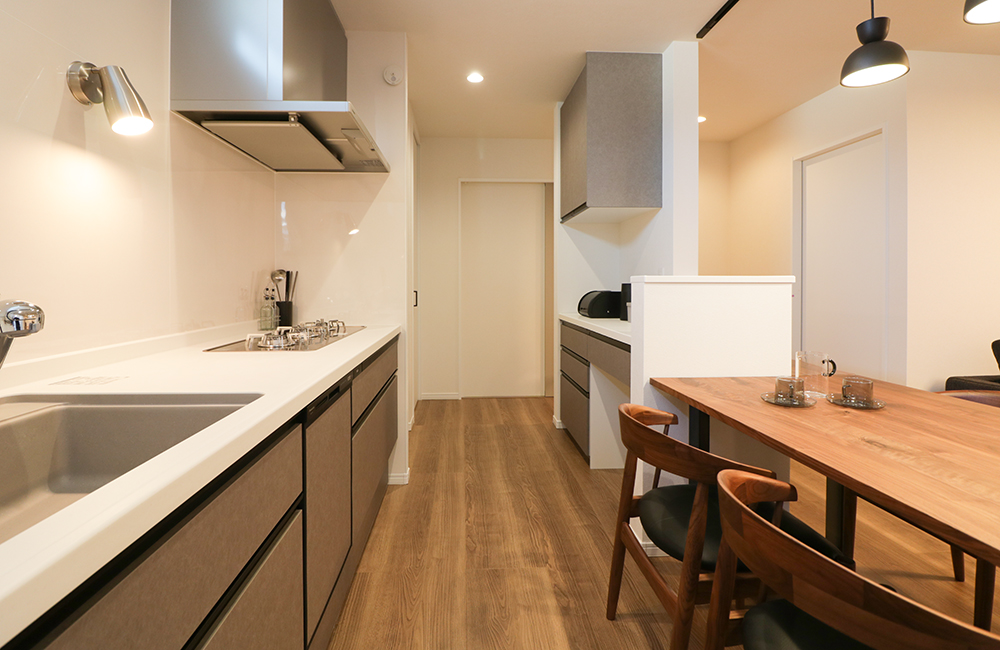 「Ⅰ型キッチン」を壁付けにすることで、ダイニングとリビングのスペースにゆとりを持たせました。さっと振り返るだけで、料理を配膳出来るので、作業効率のUPができ、油汚れや煙などがダイニングに広がりにくいというのも、壁付けキッチンならでは◎。また、壁一面に広がる3m幅のキッチンは、調理スペースや収納スペースも広く、それに併せてトリプルワイドコンロを採用することで、ご夫婦や子供と一緒に並んで料理が出来るキッチン空間です。