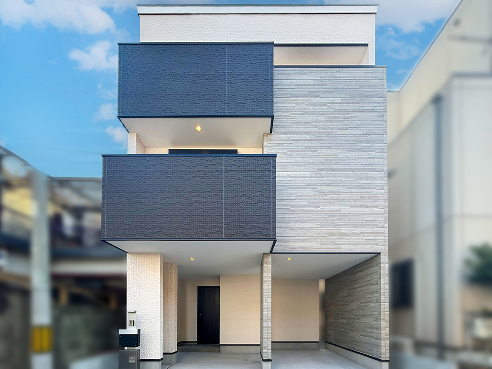 外観はホワイトをベースにしたスタイリッシュな色合い。アクセントにブラックやグレーの木目調を取り入れ、永く飽きのこないデザインに仕上げました。間口が広いので駐車がしやすく、自転車・バイクの駐車スペースと広く使うことが出来ます。車が2台駐車出来るので、来客時も安心ですね。