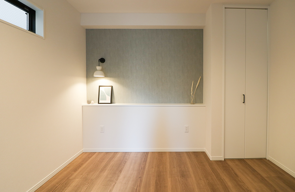 造り付けのベッドボードに、スタイリッシュなブラケット照明を配し、ホテルのようにリラックスできる主寝室。ベッドボードには、目覚まし時計やスマホなどのよく使う小物を置くことができ、便利に使えます。主寝室は1日の始まりを迎える場所であり、1日の疲れを癒す大切な場所。ただ寝るだけでなく、リラックスしたり、趣味や自分の時間を楽しめる。そんな快適な空間に仕上げました。