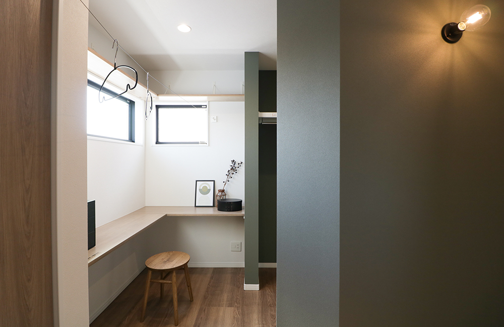 3階にはたっぷり光を取り込めるサンルームを設けました。必要な時だけ取り出せる物干しワイヤーがついており、365日、天気も花粉も気にせずたっぷり洗濯物が干せます。L型のカウンターでは、洗濯物を畳んだり、アイロンがけや子供のスタディスペースとしても使え、カウンターの下には引き出し収納を置けるスペースも。すぐ横にはファミリークローゼットもあるので、干して→しまうがラクになります。窓の上にも固定棚が付いており、収納だけでなく、お気に入りの小物を置いて楽しむこともでき、フレキシブルに使えるサンルームになりました。
