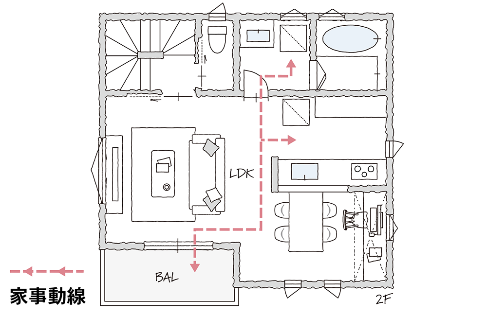 お料理や洗濯をしながらの「ながら家事」で、家事に費やす時間を短縮して、自分時間が増えるように、キッチン・洗濯室・バルコニーを、2階のワンフロアにまとめました。重い洗濯物を持って、階段を上り下りする事のない、ストレスフリーな家事動線です。