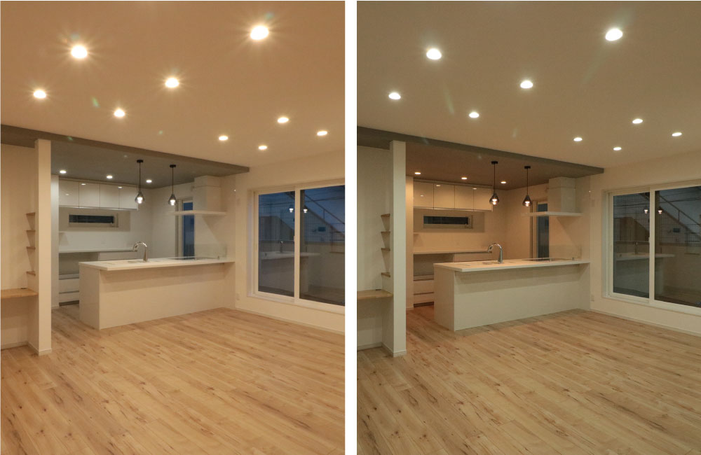 リビングダイニングの照明は調光調色機能付きのダウンライトを使用し、空間に広がりを感じられるようにしました。朝から昼にかけては昼白色でさわやかな雰囲気にしてみたり、夕方から夜にかけては電球色でリラックスできる空間にと、気分やシーンに合わせて「明かり」を楽しむことができます。