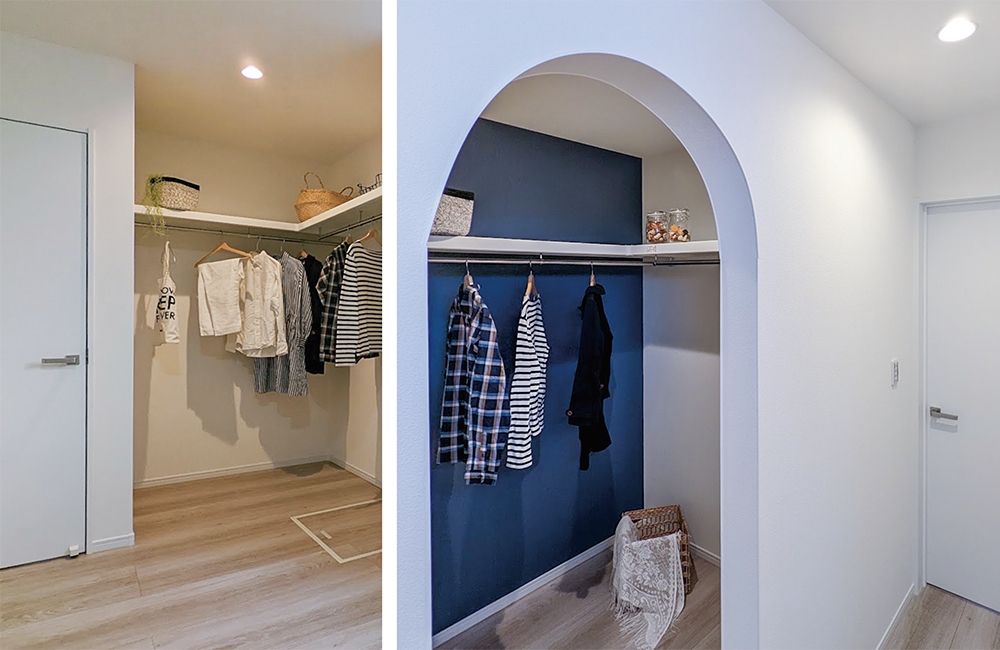 各部屋のウォークインクローゼットに加えて、3階にはファミリークロークも設けました。子供が小さい時は、家族みんなの服をまとめて収納して家事をラクに♪子供が大きくなったら、自室のクローゼットで自分の持ち物を管理させることで、「自分のモノは自分で片付ける」を自然に習慣づけることができます。ファミリークロークの入り口は、空間を広く見せるだけでなく、使うことが楽しくなるようアーチ状になっています。