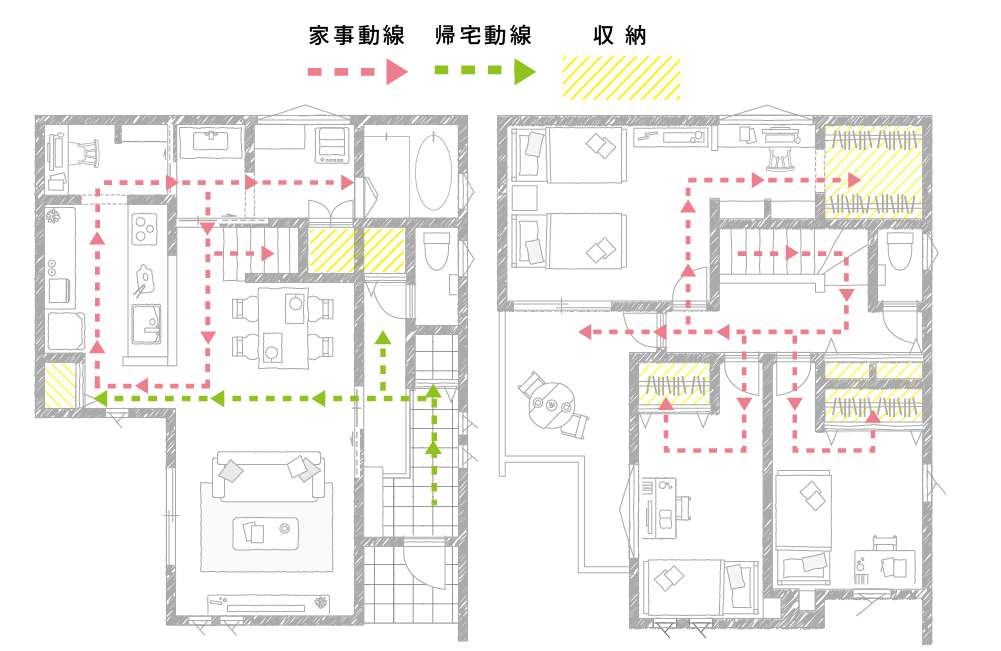 2WAYアクセスできる家事コーナーを通って、キッチン→家事コーナー→洗面・洗濯室→ダイニングと回遊できる動線。また、動線上に収納が充実していて、その都度わざわざ『取りに行く』また『戻しに行く』手間がかからないようにしています。バルコニーに干した物をハンガーごとクローゼットに収納したり、買い物に行く前に家事コーナーを中心にキッチンや洗濯室などの在庫が確認できたり、買ってきたものの収納も楽になり、家事の時短とマルチタスクが可能な間取りになっています。