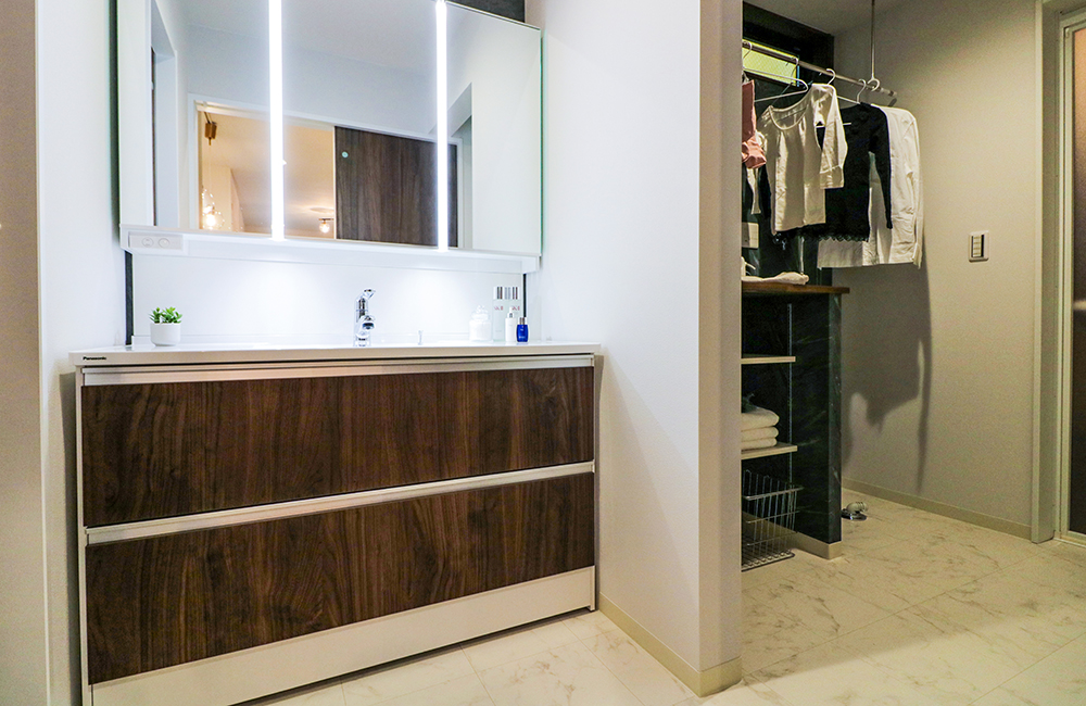脱衣室と洗面室を分けることで、誰かが入浴中でも気兼ねなく洗面台を使えるようにしました。垂れ壁にロールスクリーンを設置すれば、脱衣室の洗濯物などの生活感も隠してしまえて、お客様にも気持ちよく洗面台を使ってもらえます。脱衣室に取り付けたホスクリーンには、ちょっとした服やタオルも掛けられ室内干しも可能。可動棚には衣類乾燥機も将来設置できるようにしてあり、共働きの方も安心。可動棚の他に、扉付きの収納もあるので、取り出しやすい棚にはタオル類、隠したい洗剤や掃除道具・ストック類は収納へ。スッキリとみえる工夫が詰まっています。