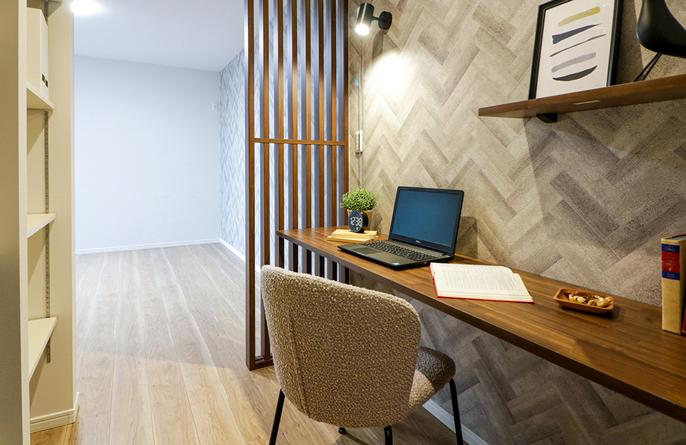 2階の主寝室に仕事や趣味に集中できる書斎を設けました。ウォールナットのダークな木目を基調に、ヘリンボーン柄のコンクリート調アクセントクロスで少しだけインダストリアルテイストを加え、落ち着きあるおしゃれな空間にしました。ワークスペースと寝室はスリット格子で繋がりを持たせながら仕切り、デスク上のスポットライトは寝室に明かりが入らないように配慮しています。背面には書棚もあって、書籍や書類をスッキリと収納でき、在宅ワークにピッタリのスペースです。