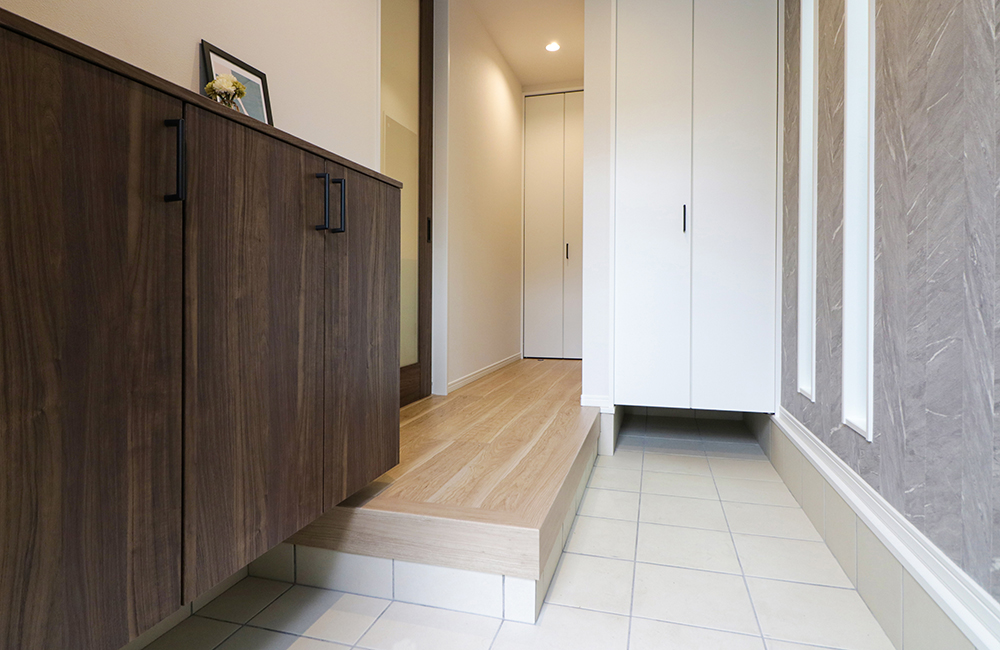 玄関には下駄箱の他に土間収納を設けました。土間収納にはベビーカーもそのまま片づけてしまえます。公園グッズなどの外遊び道具、カギや帽子などの外出時に必要なものを揃えておけば、お出かけもスムーズになります。靴以外の収納も充実していて、家の顔としての玄関がすっきりとおしゃれに保てますね。