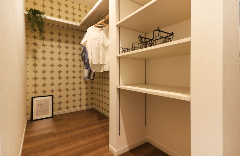 玄関よこにファミリークローゼットを設けています。ただいまと帰ってきたら、ファミリークローゼットにランドセルやバッグ、コートや制服をしまって、リビング又は自室に。みんながくつろぐリビングに、物が集まらないようにしています。毎日使うものの置き場所が決まり、花粉などの汚れもLDKに持ち込まずにすみます。重たいスーツケースやゴルフバッグなども収納でき、階上まで持って上がらなくてすむのも嬉しいですね。