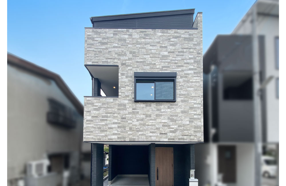 ブラックのサイディングに、少しふぞろいな石目調の外壁をアクセントにした、カッコ良さの中にも、どこか暖かさを感じる重厚感ある外観。駐車場を2台分確保しているので来客時も安心。インナーガレージにもなっているので、雨の日のお買い物も濡れるのを気にせず荷物を運べます。
