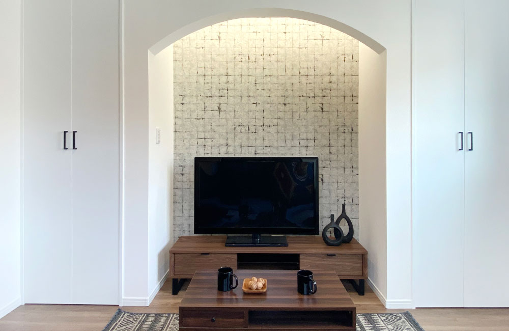 R垂れ壁の奥に間接照明を入れたテレビスペース。ふんわりとカーブした形状に、やわらかな光が広がり、リビングダイニングをやさしい雰囲気にしています。垂れ壁の形状を生かして、両脇にリビング収納もたっぷり取り、造作ならではのオリジナリティと利便性を備えた空間にしています。