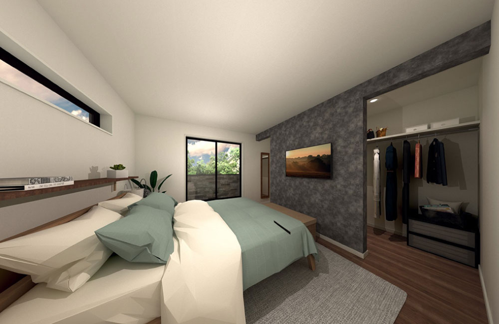 主寝室のウォークインクローゼットの入口を利用して、TVを壁掛けできるようにしました。置場に迷うテレビボードも必要なく、ゴチャ付きがちなAV廻りもスッキリし、ほこりっぽくなりがちな寝室のお掃除もしやすくなります。1日の終わりに、のんびりTVを見ながらくつろげる、そんな空間にしています。クローゼットの入口も2つに分かれていることで、夫婦の持ち物も分けて収納しやすくなりますね。