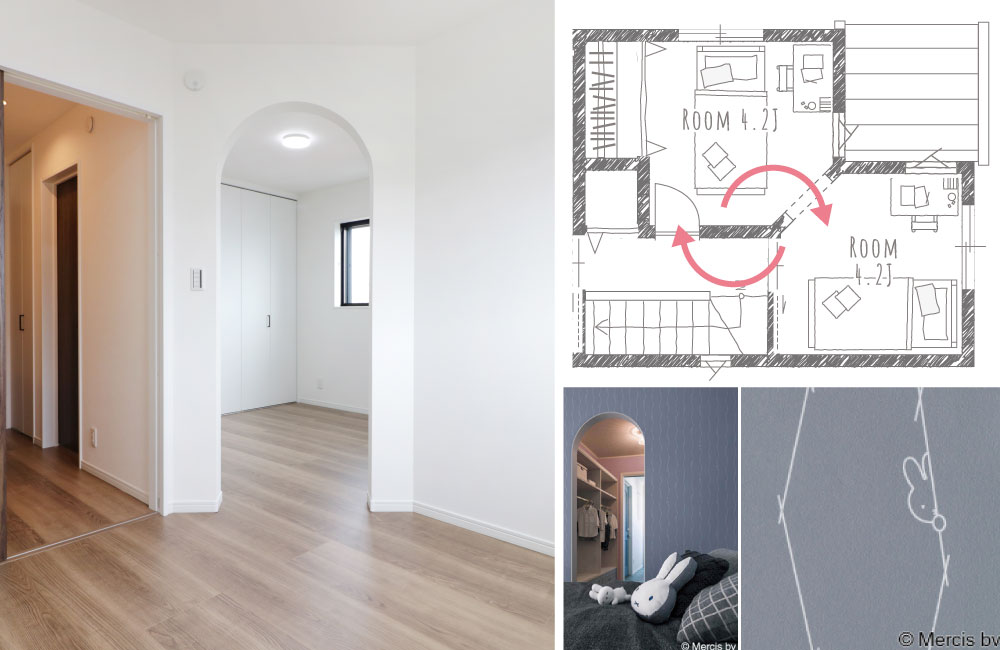 3階にある約4帖の2つの居室を、かわいいR垂れ壁でつなぎました。子ども部屋として1つを「おもちゃ部屋」、1つを「プレイルーム」に。もう少し大きくなったら「勉強部屋」と「寝室」に。兄弟が増えたらそれぞれの部屋にしたりと、子どもの成長に合わせて使えます。もちろん、夫婦でひとつずつ趣味部屋や仕事部屋にしても◎垂れ壁を通じて声をかけ合えるような、たのしく暮らせるユニークなお部屋に仕上げました。クローゼット内の壁紙が、こっそりミッフィーなのもポイントです。