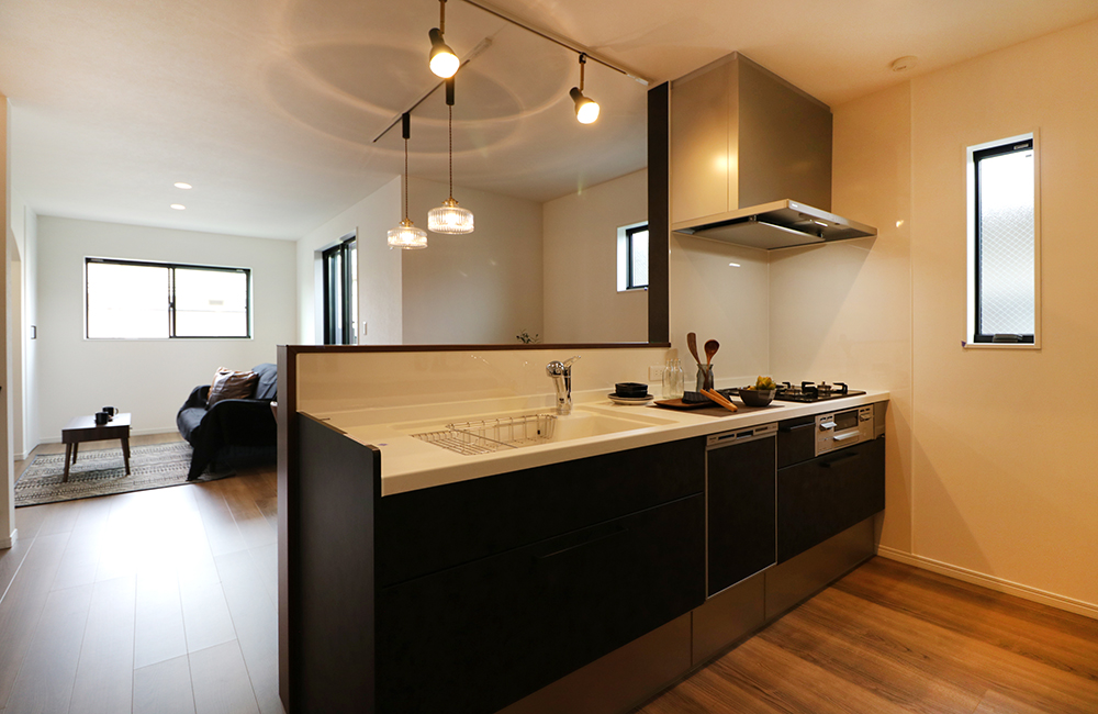 リビングもダイニングも見渡せるキッチンは、家族の様子がよくわかり、会話が弾む、コミュニケーションのとりやすいつくり。ダイニングのダクトレールには、どこか懐かしいテイストの「真鍮×ガラス」の光の陰影が楽しめるペンダントライトを設置。カウンターのスポットライトで、キッチンの手元や天井を照らす光の演出も可能に。フックを使ってグリーンや観葉植物を吊るして、カフェっぽいテイストをたのしむのも良いですね。