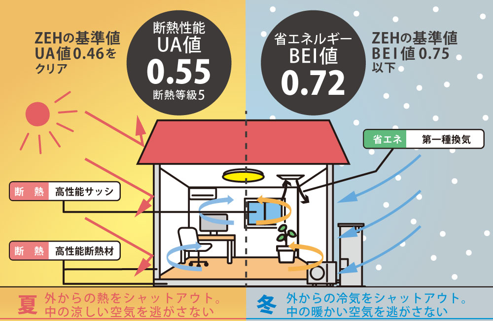高断熱(断熱等級5、UA値=0.55)・省エネルギー(BEI値=0.72)で、季節に関わらず、少ない冷暖房エネルギーで年間を通して快適に暮らせます。つまり、暑さや寒さを我慢しなくても、普通に暮らしていれば省エネルギーになり、冷暖房費を節約できます。冬場は、室内の温度差が小さくなることで結露もしにくくなり、お手入れも楽に。カビ・ダニの発生を抑え、健康に住まうことができます。