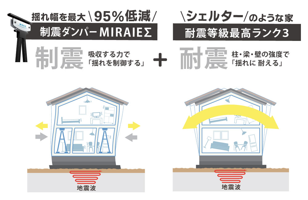 ご家族が永く安心して暮らせるように、耐震等級3(最高等級)と住宅用制震ダンパーMIRAIEΣ[ミライエシグマ]を採用しました。消防署や警察署など、防災の拠点となる建物の強さに加えて、制振で地震の本震以外にも、繰り返す余震の揺れを抑えます。MIRAIEΣは地震の揺れを吸収、低減するので、住まいの損傷を軽減し、補修費発生リスクを抑えます。また、90年経過しても性能がほとんど変わらず、メンテナンスの必要もありません。