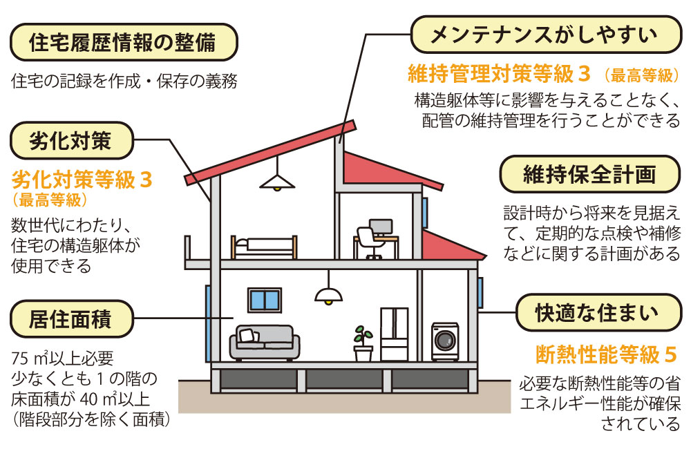 長期優良住宅とは、国が定めた基準をクリアした、長く安心・快適に暮らせる家のこと。定期的なメンテナンスと劣化対策、保守記録により、住宅の資産価値を保ち続けることができるため、長期間安心して暮らすことができます。住宅ローン控除・不動産取得税・登録免許税・固定資産税の減税などの優遇が受けられ、耐震等級が高いため、地震保険も割安になります。