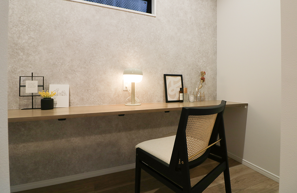リビング横に、二人が余裕で座れる広さのカウンターを備えました。少し奥まったスペースにしているので、お子さまの勉強や、作業スペースとして集中しやすい空間になっています。リモートワークも、背後の映り込みを気にせず利用できますね。窓から光が入り、コンパクトな空間でも狭さを感じることなく過ごせます。