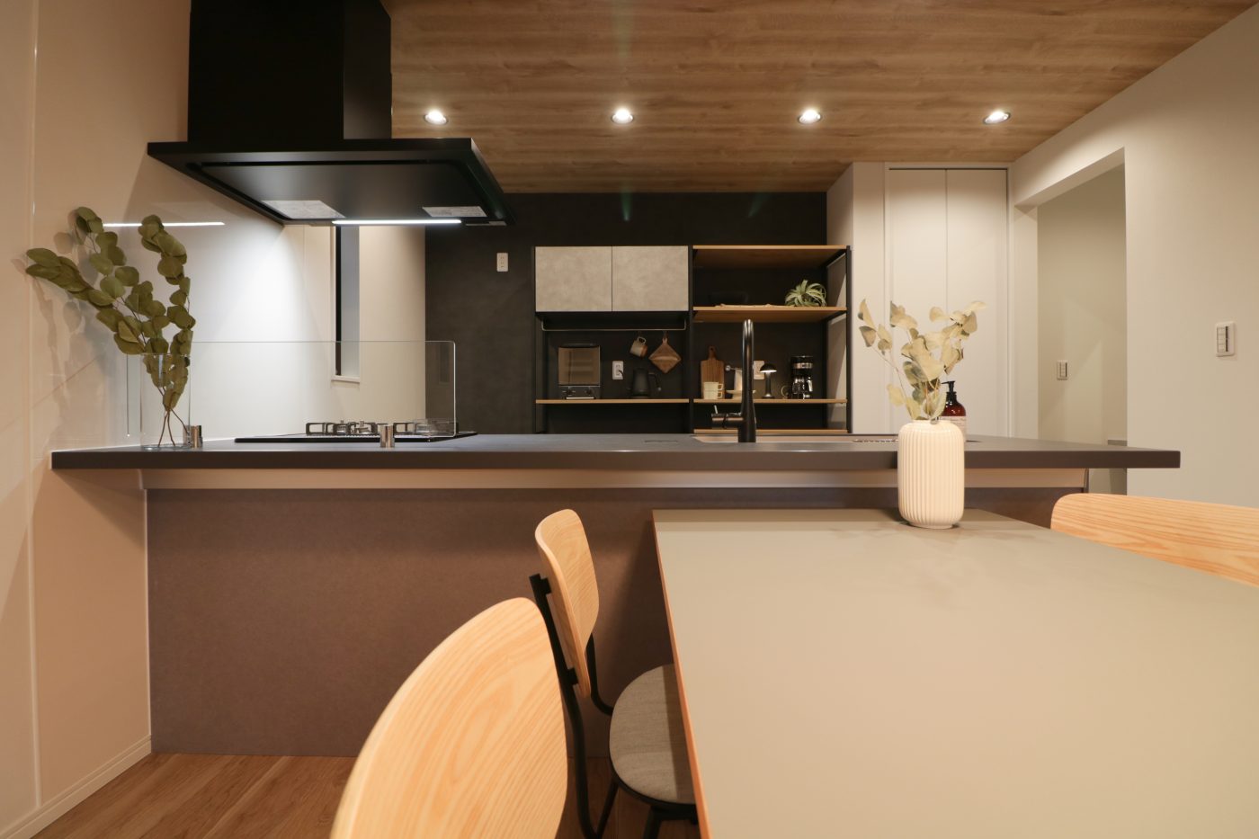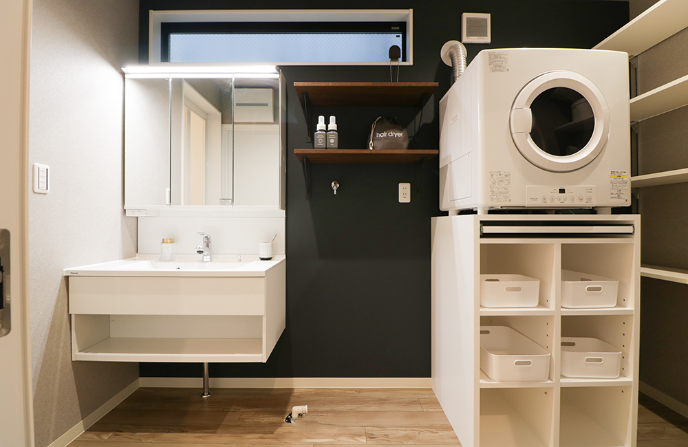 共働きや子育てで忙しい方たちにうれしい、ランドリールームのあるお家ができました。洗濯機とガス乾燥機を備えた広い洗面室のほかに、部屋干しできるスペースを設けました。時間を気にせずお洗濯ができ、雨の日や、花粉の時期も安心です。乾燥機の専用台には収納棚を設け、『乾燥機から出して畳んで片付ける』までを、一歩も動かずその場ででき、洗濯動線の最短化に。衣類の日焼け・色あせも気にすることなく、取り込んだ洗濯物をソファや畳の上に山積みにしたまま…ということもなくなりそうです。ブラックを基調とした外観に、内装はオープンキッチンや“見せる”収納など、『生活の快適さ』と『カッコよさ』がつまったお家です。