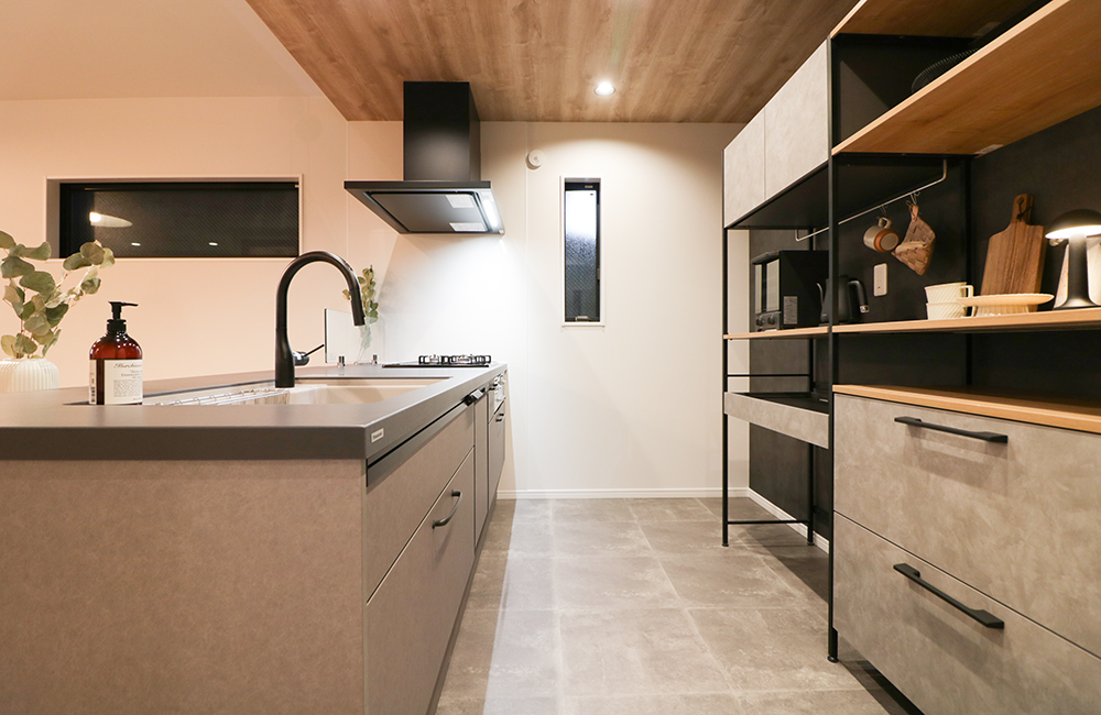 開放感ある広々とした空間になるよう、キッチンはフラットタイプに。水滴や油で汚れやすい床はフロアタイルにし、お掃除もラクラク。黒にこだわった水栓は、手や食器などを吐水口にかざすだけで吐水・止水を自動で行ってくれるハンズフリーなので、使いやすいだけでなく節水にも◎オープンキッチンにすることで、調理中もコミュニケーションが取りやすく、リビングで遊んだり、勉強している子供たちのようすも見えて安心です。