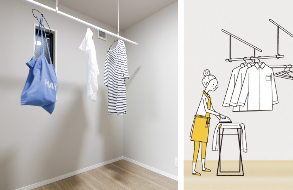 ランドリースペースとして、1階の洋室に室内物干しスペースを設けました。急な雨や、夜干し、花粉症対策にも安心です。換気扇のほか、湿度を調整してくれる「吸放湿」クロスを使用しているので、結露やカビの心配もありません。物干しを使用しないときには、竿を片側に寄せておけるので、多目的に利用でき、将来的に個室が必要になった時も使いやすいよう、テレビ端子も備えています。