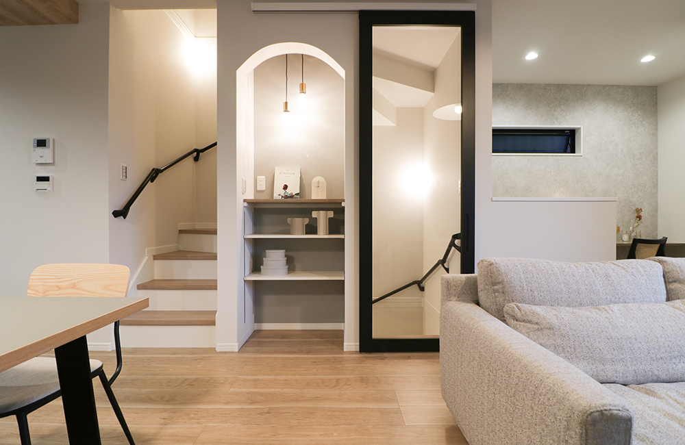 LDKの真ん中に、階段のデッドスペースを活用した、アーチ型のニッチを設けました。あえて吊るしたペンダントライトとグレーのクロスで、かわいらしさを演出。飾り棚に思い出の写真やオブジェも飾れ、目に入るだけでワクワク。家族みんなが愛着の湧く、お気に入りのポイントに。