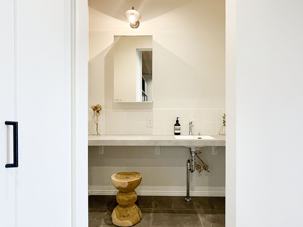 キッチン横に、幅の広いカウンターのセカンド洗面を設けました。壁面のタイル装飾や、ブラケットライトもこだわりました。広い洗面が2か所あると、あわただしい朝も混雑せず、スムーズに身支度できるのがうれしいですね。見せたくないものは、収納付きミラーの中へさっと片付けることができるので、来客時も気兼ねなく使っていただけます。