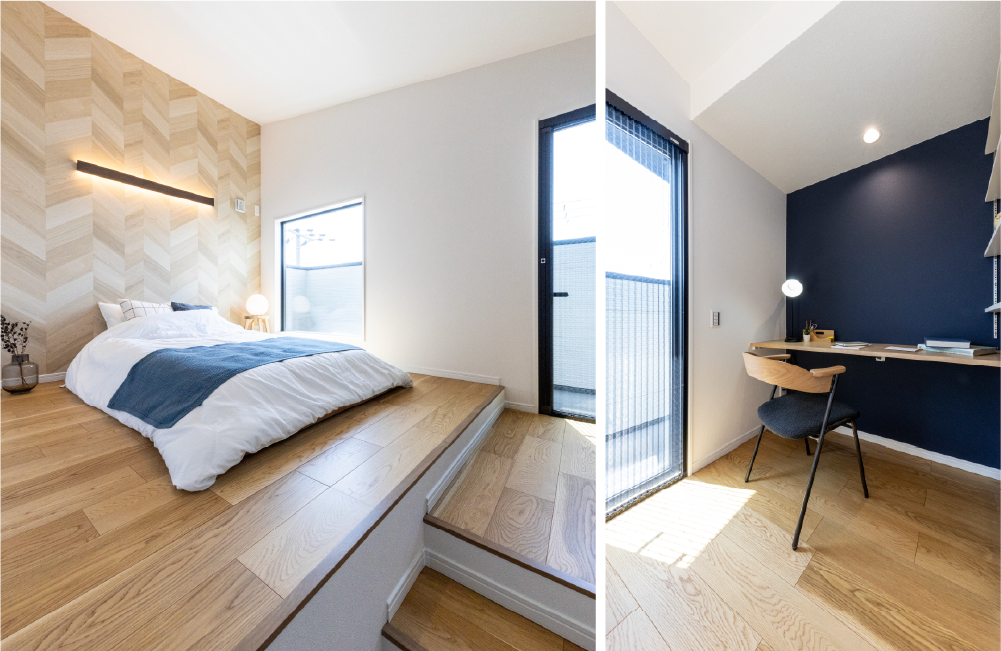 スキップフロアと勾配天井で変化をつけた主寝室は、少し特別感のある、ホテルのような空間に。主寝室内に書斎を設けており、趣味の読書や、ちょっとしたワークスペースとしても利用できます。主寝室は1日の始まりを迎える場所であり、1日の疲れを癒す大切な場所。ただ寝るだけでなく、リラックスしたり、趣味や自分の時間を楽しめる。そんな快適な空間に仕上げました。