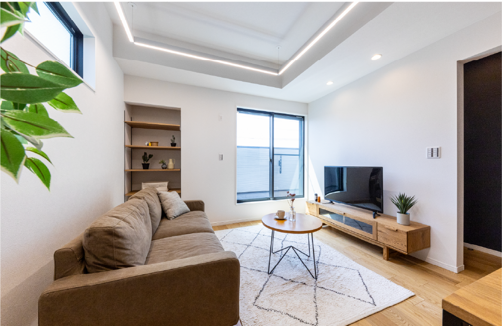 家族との大切な時間を過ごす場所として、LDKにもこだわりを詰め込みました。陽当りが良く風通しのいい2階リビングは、家族が自然と集まるくつろぎの場に仕上がりました。天井高2.8mの折り上げ天井は、立体感と開放感を演出し、スタイリッシュな雰囲気に。天井部分には、光のラインを描くようなシンプルで美しい照明を取り入れ、明るく落ち着きのある空間となっています。