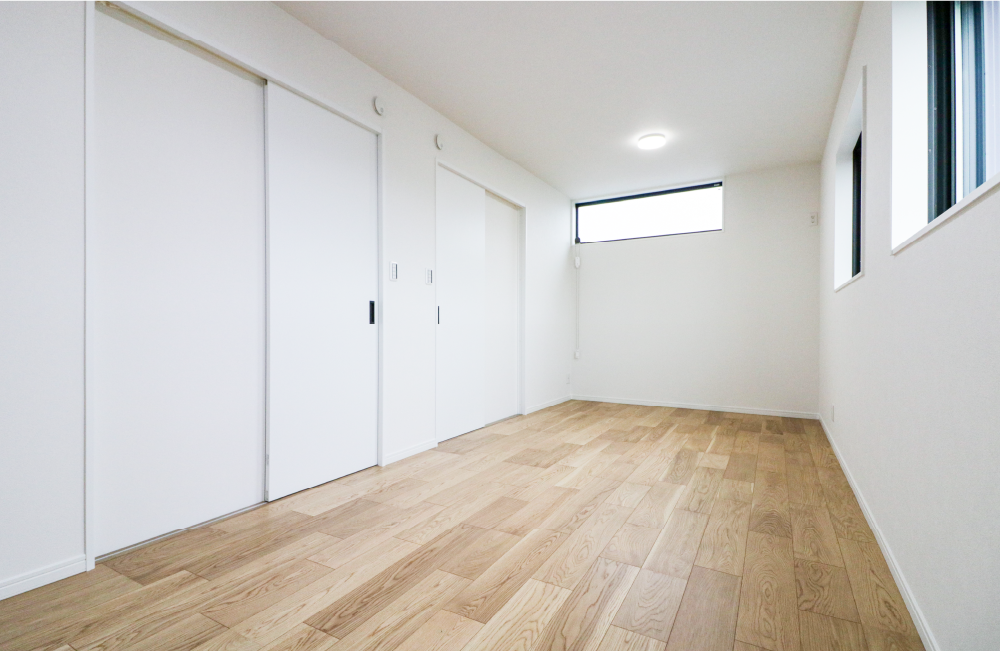 3階にお子様の成長や要望にあわせて、将来間仕切りのできる約9帖の部屋をご用意しました。子どもが小さい頃は、家族みんなが一緒に眠るファミリースペースとして使用。一人部屋が必要になったら、壁を付けられるよう下地やドア、エアコン用コンセントなどを用意しています。すぐ隣にファミリークローゼットもあるので、家族みんなの衣類もまとめて収納できます。