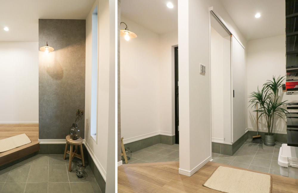 お客様用とご家族用で、玄関を2つに分けました。家族用のシューズクロークの出入り口に引き戸を設置し、玄関先からの来客の視線を遮ることで、散らかった玄関を見られないようにしています。ベビーカーや靴置き場、外出時だけ使う物を置いておけるので、家の中の整理整頓にも一役買ってくれます。家族用玄関の入口はR垂れ壁に、お客様用玄関にはアクセントクロスとアンティーク風ブラケットライトを施し、おしゃれな玄関にしています。
