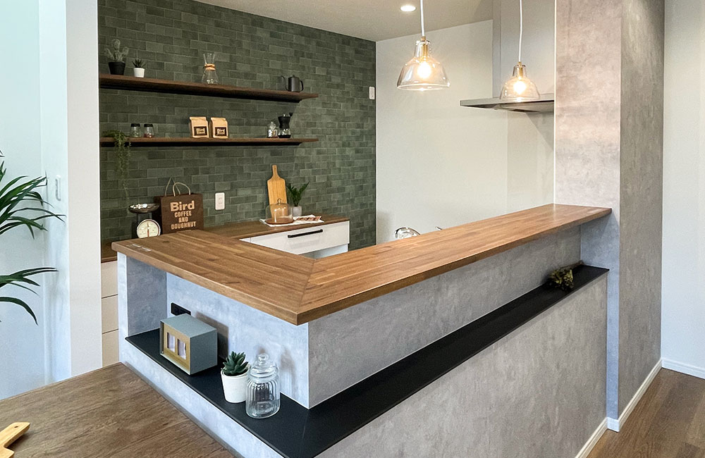 ぐるっとまわりがニッチになっているキッチンカウンターと、壁面をアンティークな雰囲気のタイル調のクロスと飾り棚を施し、まるでオープンキッチンのカフェのような雰囲気。よく使うものや、家電は手の届きやすい位置に、パッケージのかわいい食材やコーヒー道具、スパイスは飾りながら収納。カウンターニッチの正面側は、見た目にこだわり、お気に入りの雑貨や写真を飾って、ダイニング側には、毎日使う調味料やティッシュを隠してメリハリある収納に。横並びダイニングになっているので、家事をしながら、テーブルにいる家族やお客様との会話もたのしめるキッチンです。
