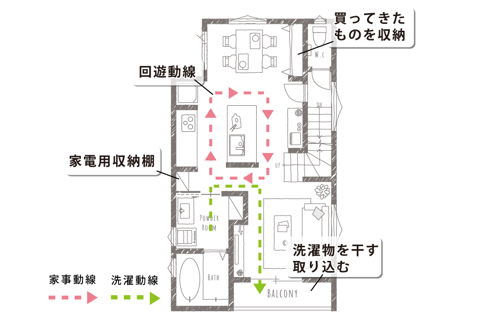 キッチンを中心に、リビング・ダイニング・洗面室・バルコニーがつながったコンパクトな動線。キッチンのすぐ横に洗面室があるので、お鍋の様子を見ながら洗濯したり、たたんだり、ながら家事ができる間取りです。また、洗面室とバルコニーを同じフロアにすることで、重い洗濯物を持って、階段を上り下りする事なく「洗う」→「干す」の洗濯作業もスムーズに。