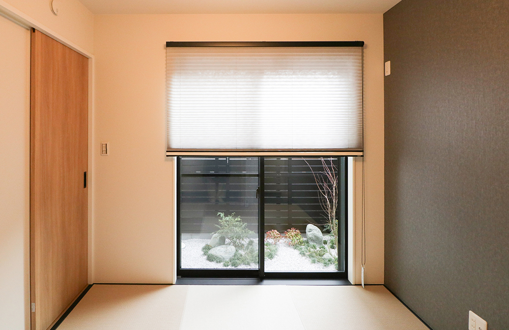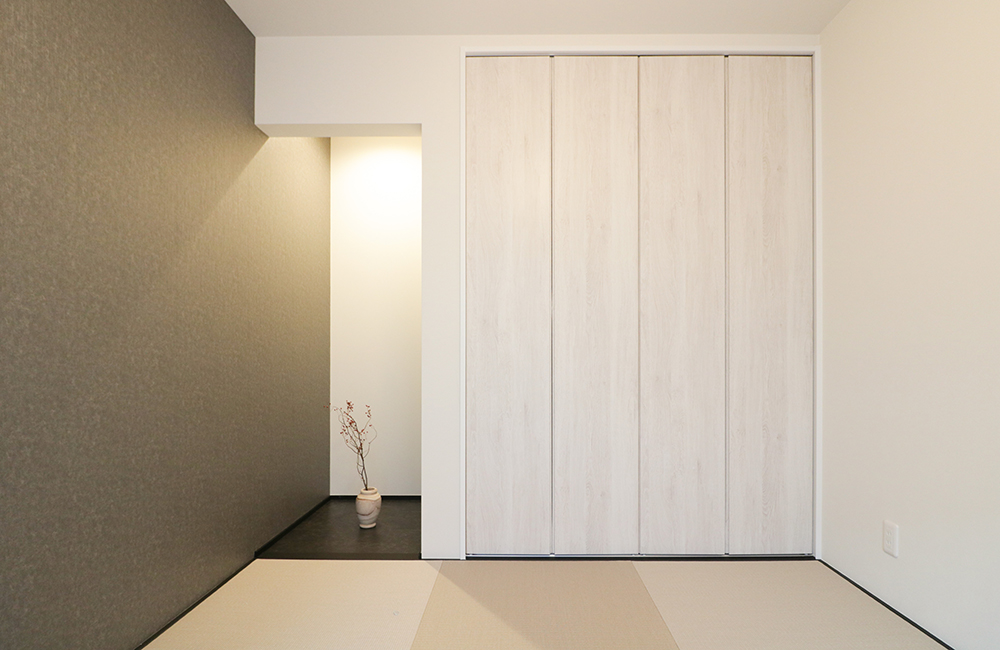 ブラックのアクセントクロスやグレージュ色の畳、床の間にブラックで石目調の床材をあしらった、和モダンな和室。大きな窓から坪庭を眺められる和室は、非日常的な雰囲気を感じられ、リラックスできる空間となりました。玄関から入ってすぐのところにあるので、リビングなどの生活居室を通ることなくお客様を案内できる客間としても。