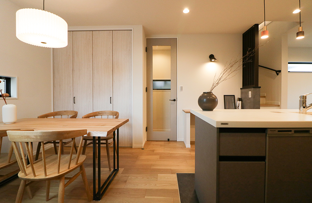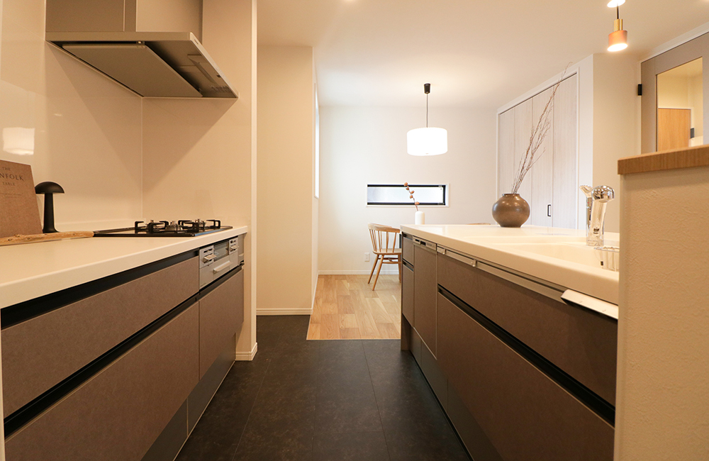 ぐるりと廻れるオープンタイプのⅡ型キッチン。リビングとダイニングのどちらからでも出入り出来るので、家事などの移動距離を短縮でき、朝の忙しい時間帯も家族の渋滞が起こらずスムーズに行動できます。背面には、食器や家電類を収納できるインテリアカウンターがあり、振り返るだけで食器を用意することも、ご飯をよそうのもラクちん。また、キッチンの床材をブラックの石目調にすることで、和モダンを演出しています。