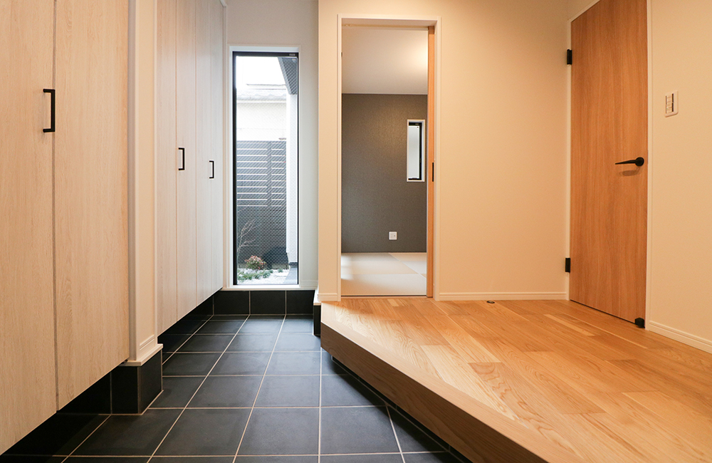 2人並んで靴の脱ぎ履きが出来るゆとりのある玄関。みんなの靴をしまえる大容量のシューズクロークに、カバンや帽子、自転車のヘルメットや子どものお出かけセットなど、外出時の身の回り品を収納できる可動棚を設けました。棚の高さを変えるとベビーカーなども収納することが出来ます。また、玄関を開けると正面には、こだわりの坪庭を眺められる大きな窓が。家に帰ってきた時や来客時に、心が豊かな気持ちになれる玄関空間です。