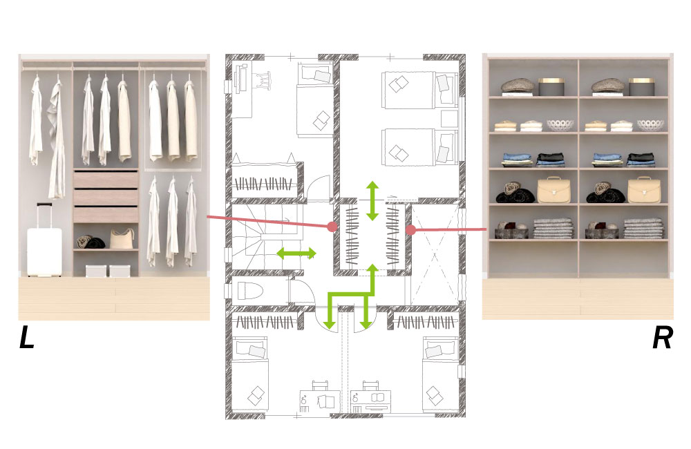 主寝室のクローゼットを、廊下からも出入りできるウォークスルータイプにすることで、「主寝室のクローゼット」「家族共有のファミリークローゼット」として、多目的に使えるようにしています。収納ユニットを採用し、床から天井まで空間を無駄なく使え、ショップのように、すっきりおしゃれに整理整頓できるようにしています。