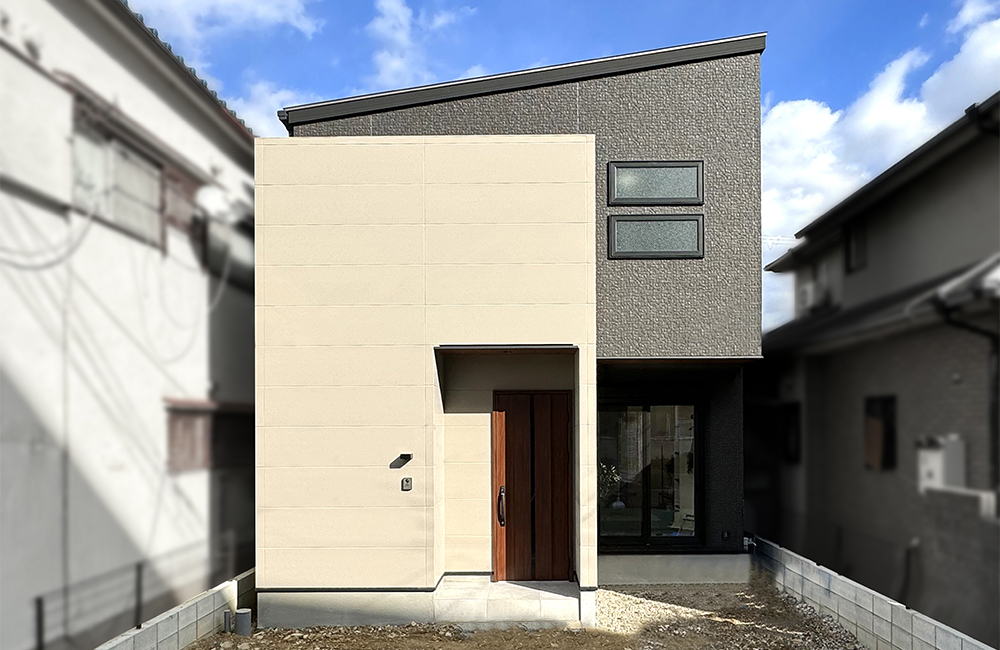 フラットで落ち着いた色合いの外観は、玄関ドアと軒天の木目がアクセント。正面のバルコニー手摺り壁を高く立ち上げることで、シンプルな形状の中にもインパクトを感じる外観にしています。