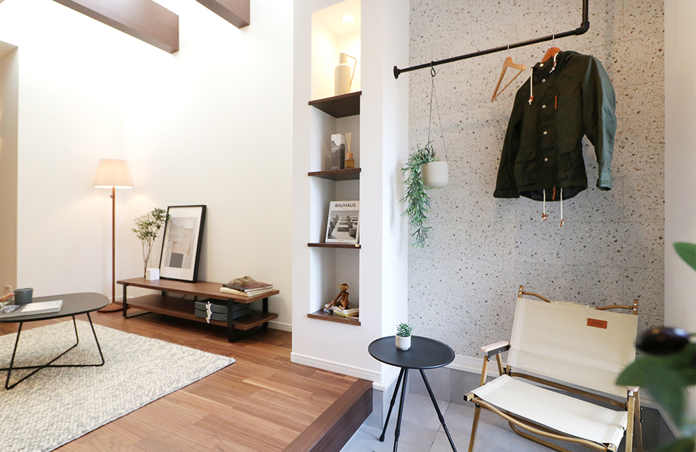 吹抜けを設けたリビングに土間を取り入れ、屋内と室内をゆるやかにつなげた、のんびりスローライフを楽しめるお家が完成します。セカンドリビングにもなる土間スペースで、アウトドア気分を楽しんだり、子どもやペットも汚れを気にせず過ごせ、お手入れもらくちん。土間をリビングに取り入れたり吹抜けを設ける事で、素材や高さの違いなど視覚的変化で、メリハリと広がりを感じる空間をつくり出しました。内装はウォールナットの突板フロアや集成カウンター材で、落ち着いた色合いと素材感を際立たせ、建具や壁はホワイトで統一して明るさをプラスしました。道路を挟んだ向かい側のマンションからの視線が気になる立地だった為、リビングへは吹抜けを通して南側からの光を取り入れ、南東からは日陰の涼しい風を取り込めるよう建物形状を工夫しました。