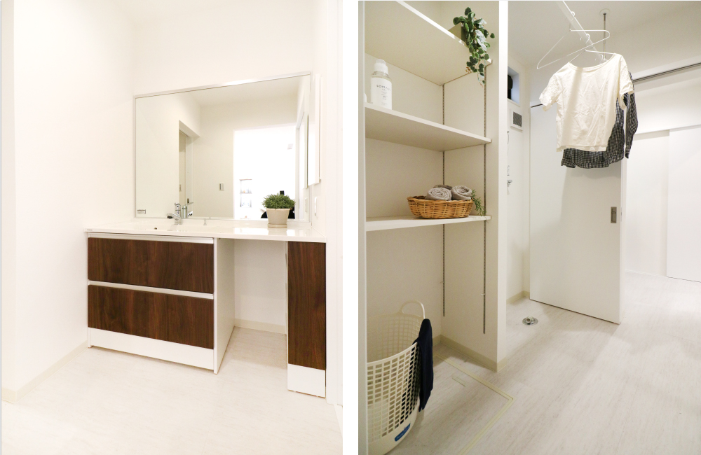 玄関からもリビングからも、アクセスしやすい広めの洗面室。外出から帰って来て、スムーズに手洗い・うがいを行えます。リビングの続きにあるので、冬の寒さを感じずに、朝の支度も快適にすませられます。洗面と脱衣室が別々になっているので、誰かが入浴中で、洗面が使いずらい、ということもなくなります。脱衣室には、雨の日や花粉の季節に便利な、室内物干しも設けています。