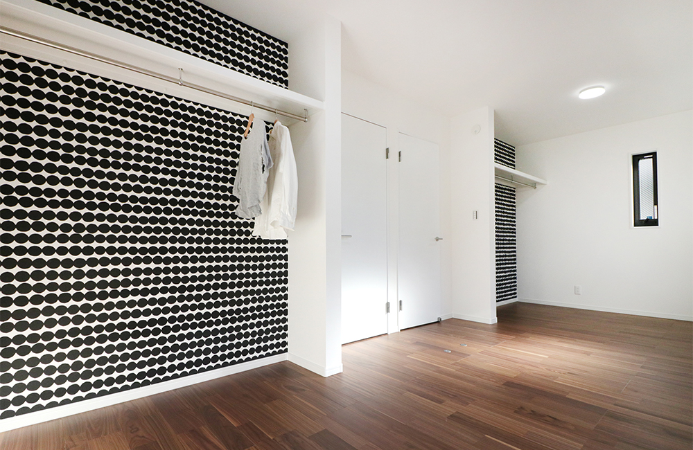 3Fに子どもの成長や要望にあわせて、将来間仕切りのできる約9.6帖の部屋を設けました。子どもが小さい頃は、ご家族みんなが一緒に眠れるファミリースペースとして。子ども達が成長し、それぞれの部屋が必要になった時には、部屋を分けられるよう、天井に下地を設け、ドアや収納も2つずつご用意しています。クローゼット内には、フリーハンドで描かれた丸の連続がチャーミングな“marimekko ”のクロスを用いておしゃれな印象に。