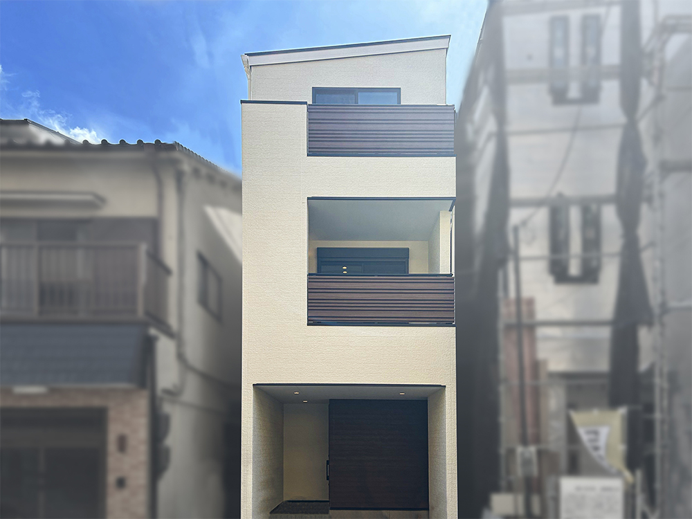 バルコニーの横格子ルーバーがアクセントになった、すっきり・おしゃれな外観。道路から家の中が見えないよう、ドアを垂直に付けています。防犯だけでなく、見た目もすっきりし、安心して暮らすことができます。