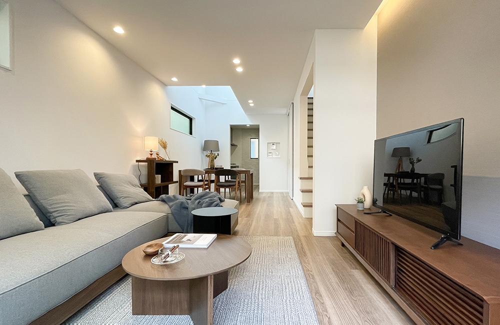 最大2間間口しか建てられない、細長い敷地形状のため、いかに広く・明るく設計できるか工夫を重ねながら設計しました。細長形状のリビングは、開放的で広々とした印象になるよう吹抜けを設け、暗くなりがちな奥のキッチンまで明かりが届くよう計画しています。テレビ上部のコーニス照明で壁面を照らすことにより空間に広がりを与え部屋を広く見せる、などの工夫を施しています。