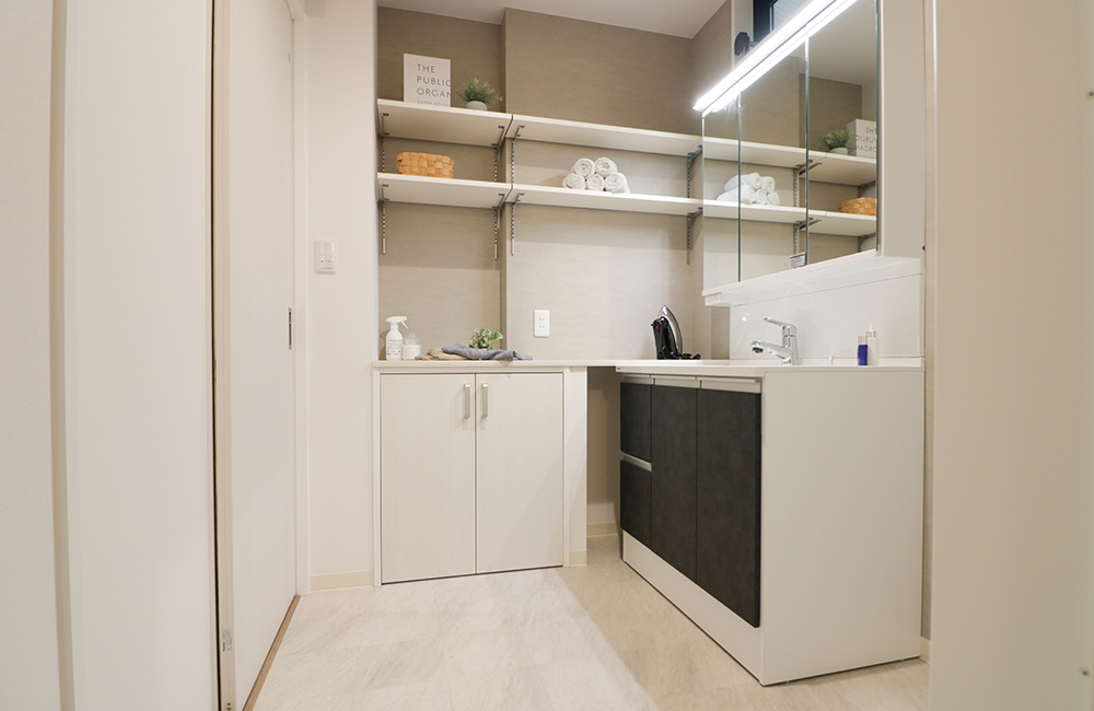 乾いた洗濯物を畳んだりアイロンがけもできる「ワークカウンター」と、洗濯まわりの小物、タオルや下着を収納できる「扉付きの収納」と「可動棚」をご用意しました。洗濯機上部には乾燥機が置ける棚とガス栓も設けているので、「洗濯→乾かす→アイロンがけ→たたむ」までを1つのスペースで完結させることも可能。部屋移動も少なくなり、家事ラクと時短が手に入ります。