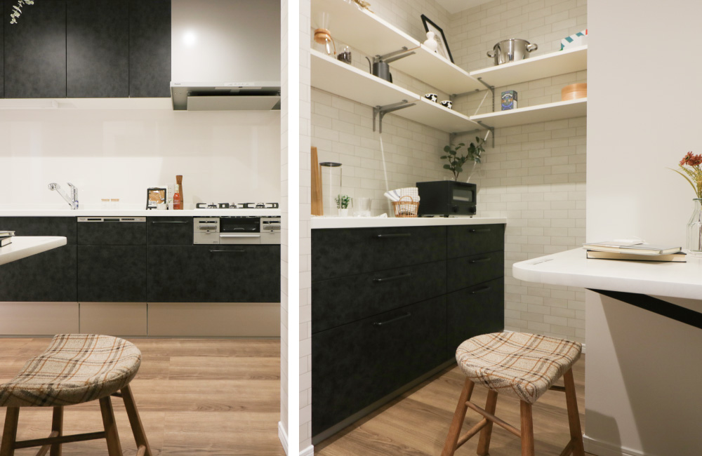 対面キッチンやオープンキッチンが多い昨今。あえて個室感ある壁付のⅠ型キッチンにしました。「お料理好きでキッチンにいるのが好き」「来客が多く生活感を見られたくない」という方にぴったりなキッチン。こもり感があるので、子どもに隠れてこっそりちょっといいお菓子を食べたり、タブレットで新しい料理を調べたりできる快適空間です。他の部屋との繋がりも少ないので、インテリアも存分に自分好みにできるのも嬉しいポイントです。