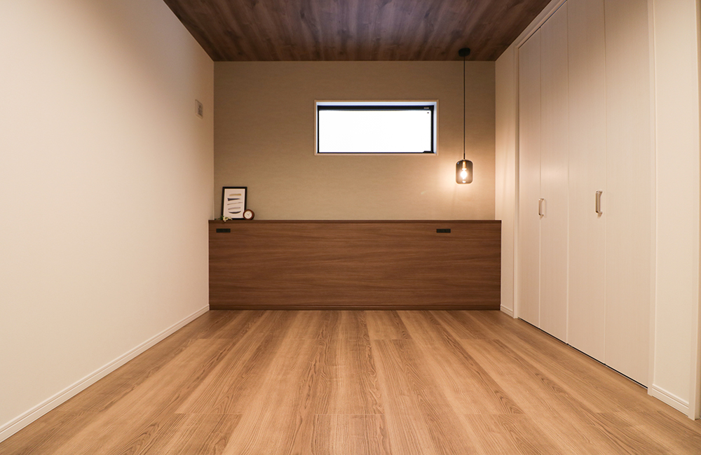 ホテルのようなワンランク上の寝室を演出できるよう、壁をウォールナット柄×グレージュに、天井はオーク柄の落ち着いた雰囲気のクロスでコーディネイトしています。ベッドサイドにはペンダントライトで心地よい明かりを、天井はすっきりとダウンライトを配し、ほんのりした明かりでリラックスできる空間にしています。造り付けのヘッドボードには、スマホや読みかけの本、アートを飾ってもいい雰囲気に。