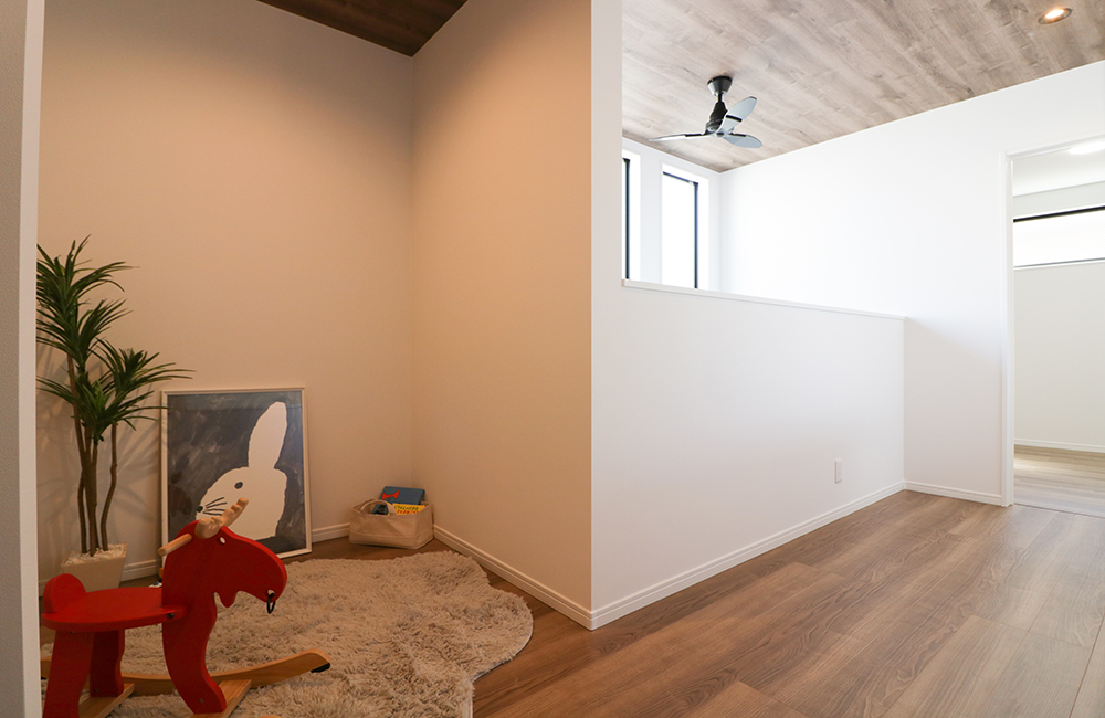 3階吹抜けに面した、居室と居室のあいだのフリースペース。子どもが小さい間はプレイルームとして廊下と合わせて広く使え、大きくなってきたら、ご主人の書斎スペースや奥さまのワークルームに。将来壁を作れるよう、下地を補強してあるので、間仕切りを設けてクローズドクローゼットにすることも可能です。廊下部分の吹抜け側にデスクや本棚を置いて、家族で使える共用スペースにしても素敵◎